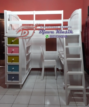 Model Tempat Tidur Susun dan Meja Belajarmerupakan tempat tidur anak produk dari Djavu Klasik Furniture yang di proses produksi langsung di workshop sendiri dengan tukang kayu yang berpengalaman dalam bidangnya dan di lengkapi meja belajar, Laci dan rak buku. Dalam proses produksi tempat tidur tingkat ini, kami senantiasa memantau pelaksanaan dari setiap bagian dan prosesnya, tujuan kami ialah mendapatkan hasil yang optimal dan berkualitas, sehingga dapat awet dan tahan lama baik dikala dipakai di kamar tidur anak.